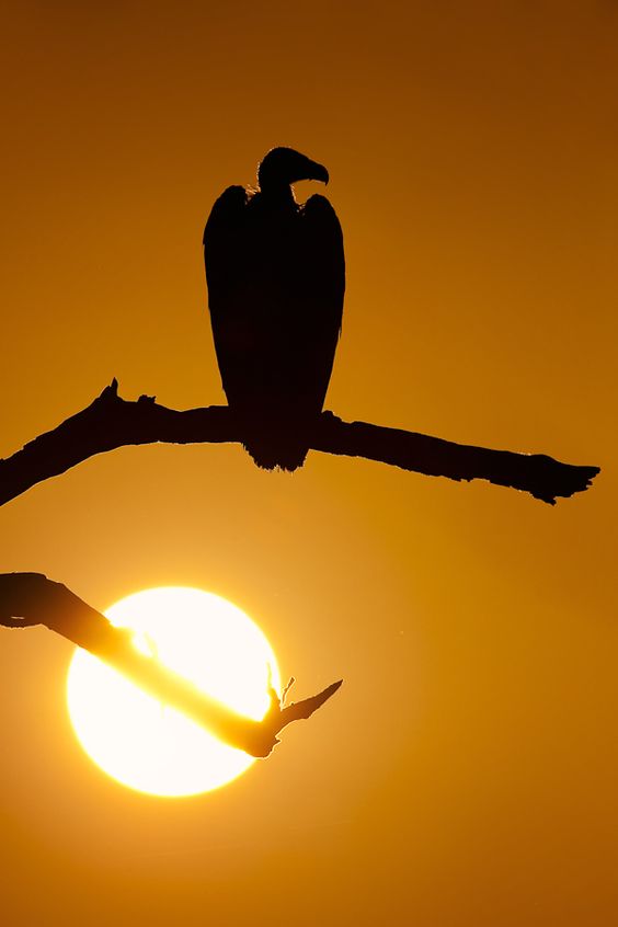 A Cape Vulture (Gyps coprotheres) silhouetted at sunset in Kruger National Park, South Africa.