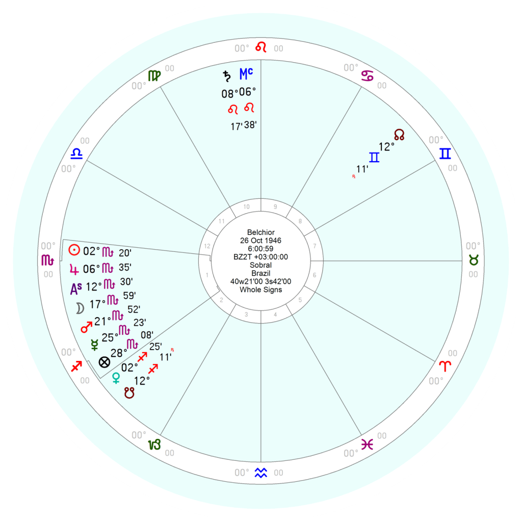 Saturno – ♄8 º♌17’ – projeta seu antiscion – ♄21 º♉43’ – na casa VII (associada às relações amorosas) em oposição ao regente do ascendente – ♂ 21º♏52’.